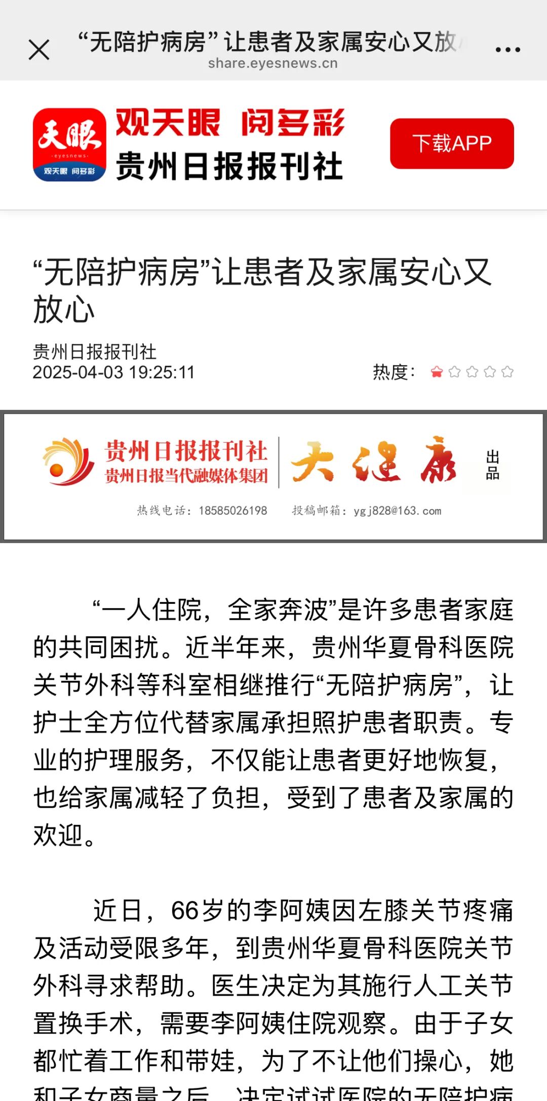 近半年来,贵州华夏骨科医院关节外科等科室相继推行“无陪护病房”,让护士全方位代替家属承担照护患者职责。专业的护理服务,不仅能让患者更好地恢复,也给家属减轻了负担,受到了患者及家属的欢迎。此便民举措,得到了《天眼新闻》《众望新闻》等媒体的报道。