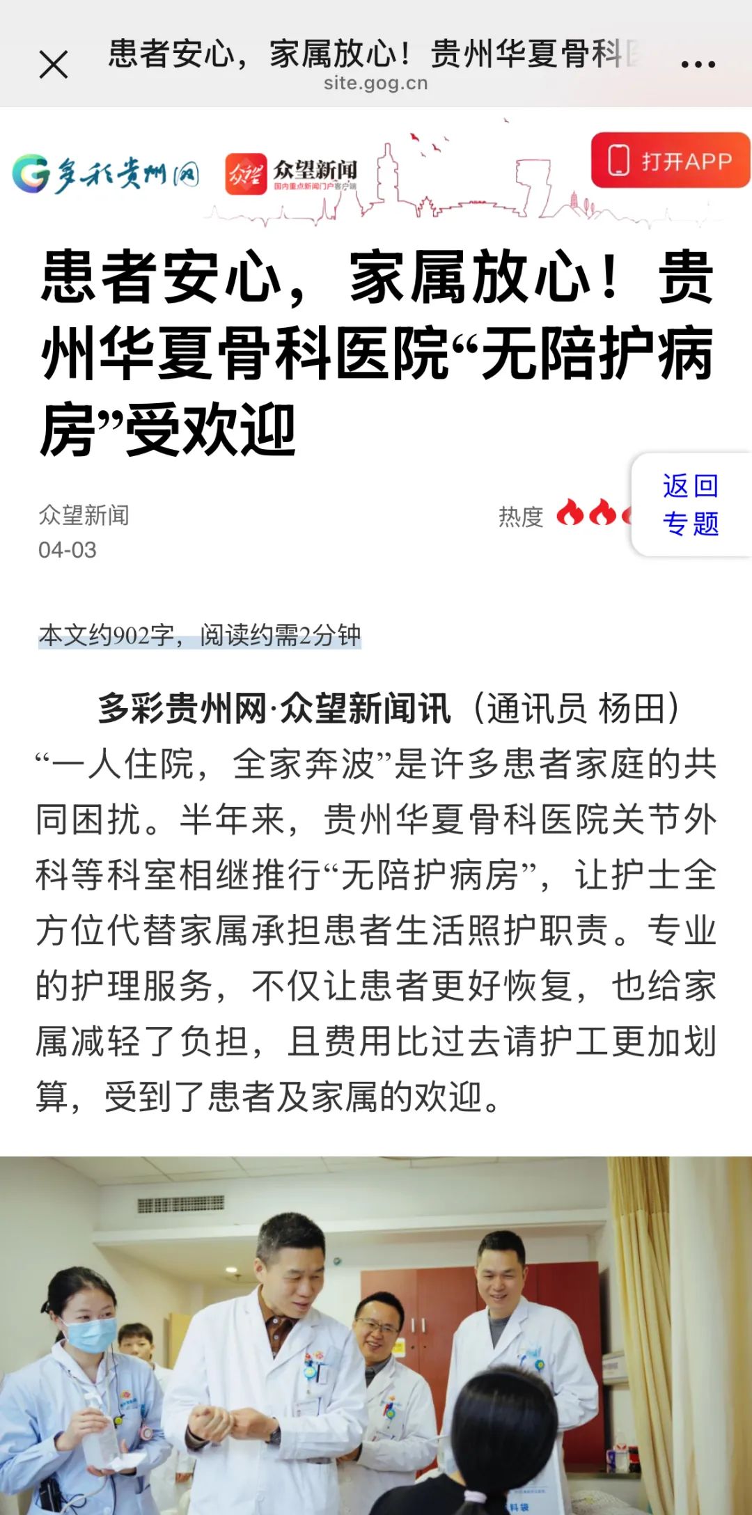 近半年来,贵州华夏骨科医院关节外科等科室相继推行“无陪护病房”,让护士全方位代替家属承担照护患者职责。专业的护理服务,不仅能让患者更好地恢复,也给家属减轻了负担,受到了患者及家属的欢迎。此便民举措,得到了《天眼新闻》《众望新闻》等媒体的报道。